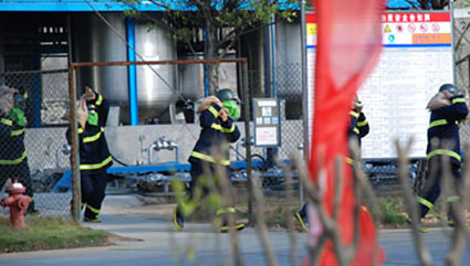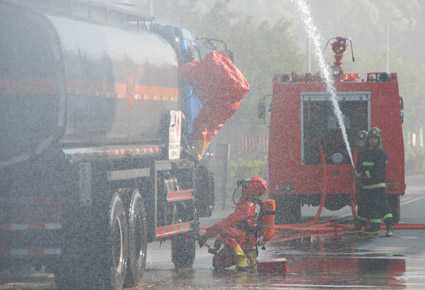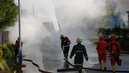 演練模擬了廣州保賜利化工有限公司內(nèi)一臺(tái)20立方米容量載有154噸丙酮的槽車在卸車時(shí),發(fā)生泄漏,安檢巡查人員發(fā)現(xiàn)后,立刻向現(xiàn)場負(fù)責(zé)人報(bào)告,現(xiàn)場負(fù)責(zé)人起動(dòng)預(yù)案組織搶險(xiǎn),但因過于慌亂,損壞了槽車閥門,泄漏無法控制。廣州保賜利化工有限公司立即向鰲頭鎮(zhèn)匯報(bào)了情況,并向110、從化市應(yīng)急辦及從化市安全生產(chǎn)監(jiān)督管理局報(bào)警,請(qǐng)求救援。接到報(bào)警后,市各應(yīng)急救援部門抵達(dá)事故現(xiàn)場,成立應(yīng)急救援指揮部,并根據(jù)現(xiàn)場情況,指揮部命令成立應(yīng)急救援攻堅(jiān)隊(duì),消防大隊(duì)通過偵查后遂展開全面救援。通過三項(xiàng)救援方案:一是組織現(xiàn)場搶險(xiǎn)人員,封堵罐區(qū)對(duì)外排水出口,并用沙袋、水泥灰等筑起防護(hù)堤,防止泄漏流淌面積進(jìn)一步擴(kuò)大;二是組織有效力量,對(duì)槽車進(jìn)行冷卻,稀釋空氣中的丙酮;三是利用干粉、水泥灰和泡沫配合進(jìn)行滅火,經(jīng)過25分鐘的救援,大火終于被撲滅,并成功堵漏。最后各相關(guān)職能部門對(duì)事故后序工作開展了相應(yīng)的處置,整個(gè)演練圓滿結(jié)束。