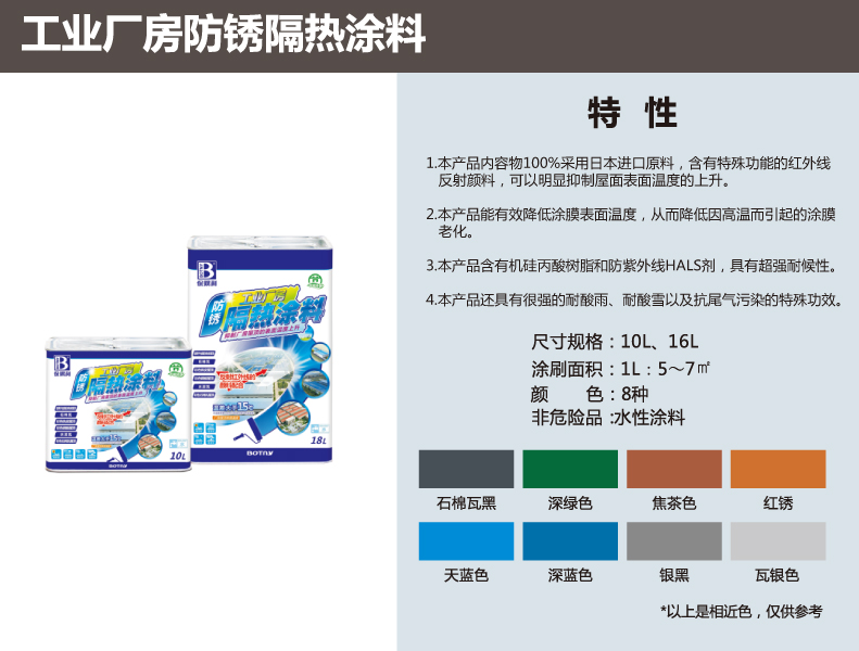 特性:本產(chǎn)品內(nèi)容物采用100%的進口原裝材料,里面含有特殊的紅外線反射顏料和空中微粒,可以明顯抑制屋面表面溫度上升。這種涂料還有降低涂膜表面溫度,從而降低因為高溫而引起的涂膜老化,除此之外這種節(jié)能隔熱降溫涂料還具有防水的功能和防銹的功能,價格方面跟同種涂料也占有極大的優(yōu)勢,反射隔熱涂料價格可向公司相關銷售人員咨詢。
