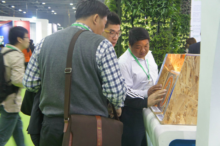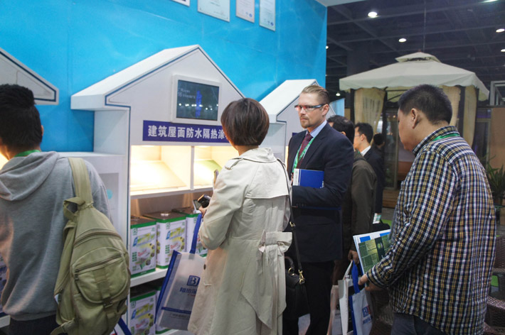 展會現(xiàn)場在客戶體驗區(qū)里,幾款新穎獨特的,模擬太陽光照射在金屬屋頂、混凝土屋面、建筑外墻的產(chǎn)品樣板演示道具,吸引了眾多觀眾的眼球。在我司專業(yè)工作人員的熱情接待下,客戶了解并感受了產(chǎn)品的測試效果。從現(xiàn)場的精密測溫儀器和客戶的親身感受來看,涂刷過我司“BOTNY“隔熱涂料的樣板與涂刷普通涂料的樣板溫差最高可達(dá)15℃,與此形成鮮明對比,產(chǎn)品隔熱效果立竿見影,得到了業(yè)界人士的高度認(rèn)可。很多觀眾在參觀了我司展位后都對我司隔熱涂料系列產(chǎn)品的涂裝效果,產(chǎn)品性能、質(zhì)量贊不絕口。