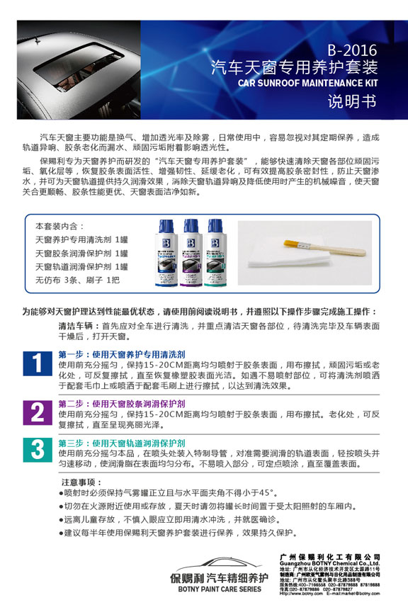 保賜利專為天窗養(yǎng)護(hù)而研發(fā)的“汽車天窗專用養(yǎng)護(hù)套裝”,能夠快速清除天窗各部位頑固污垢、氧化層等,恢復(fù)膠條表面活性、增強(qiáng)韌性、延緩老化,可有效提高膠條密封性,防止天窗滲水,并可為天窗軌道提供持久潤滑效果,消除天窗軌道異響及降低使用時產(chǎn)生的機(jī)械噪音,使天窗關(guān)合更順暢、膠條性能更優(yōu)、天窗表面潔凈如新。